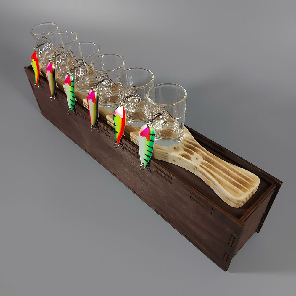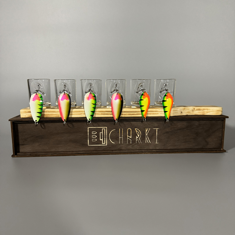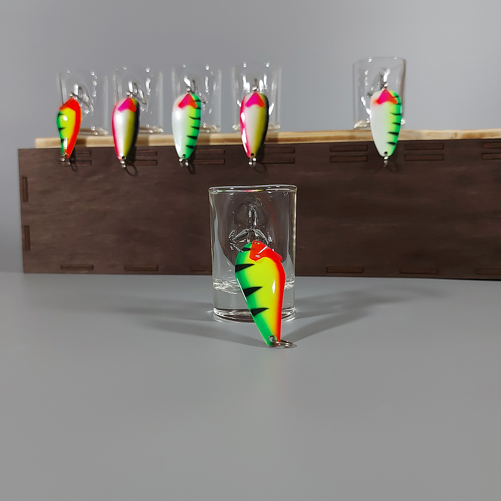 Подарунковий набір чарок з оригінальною вставкою-блешнею — стильний та незвичайний подарунок для любителів риболовлі та поціновувачів ексклюзивного посуду. Кожна чарка виготовлена зі скла та декорована справжньою рибальською блешнею, що робить набір унікальним та привабливим.