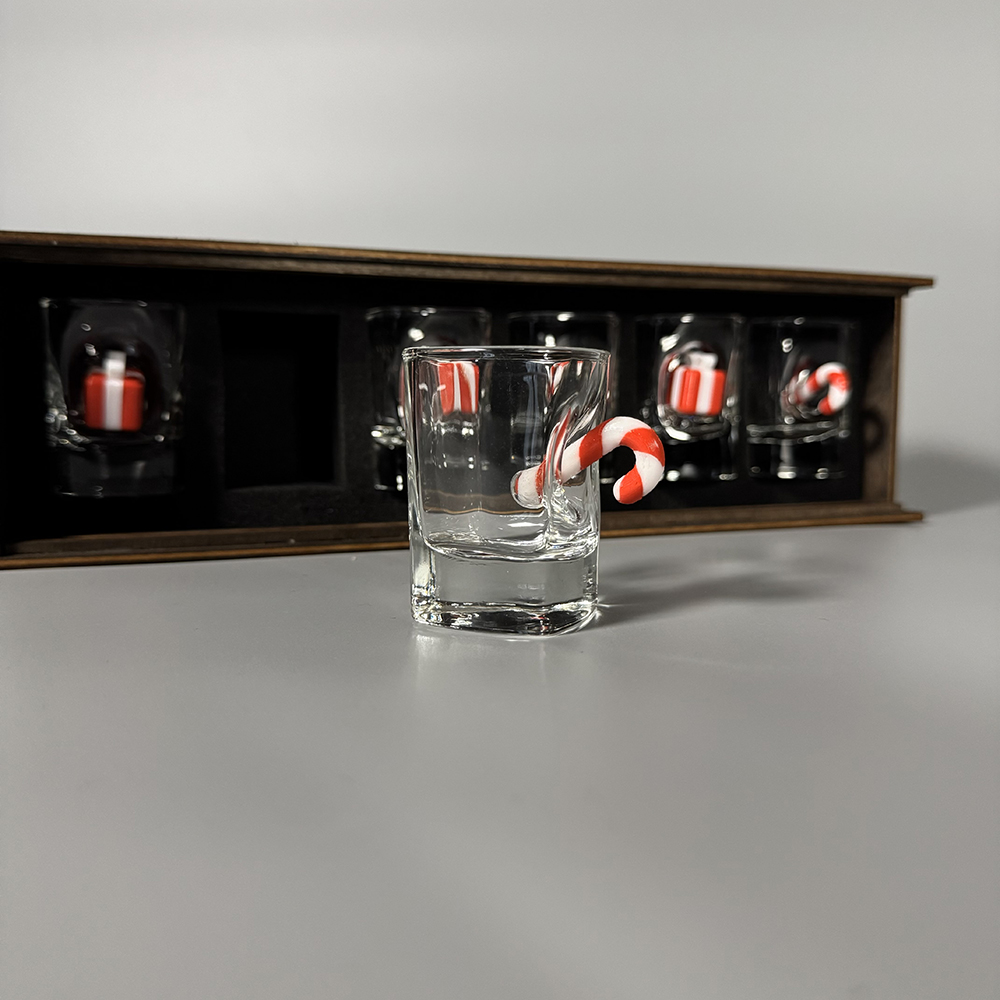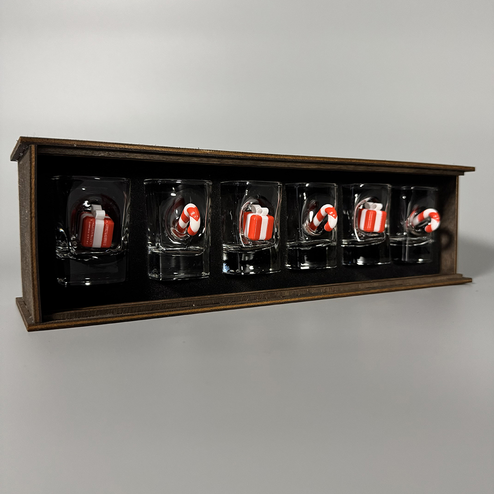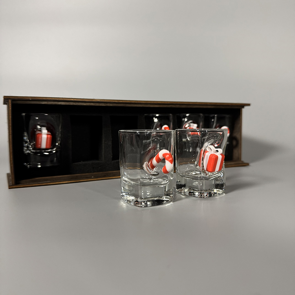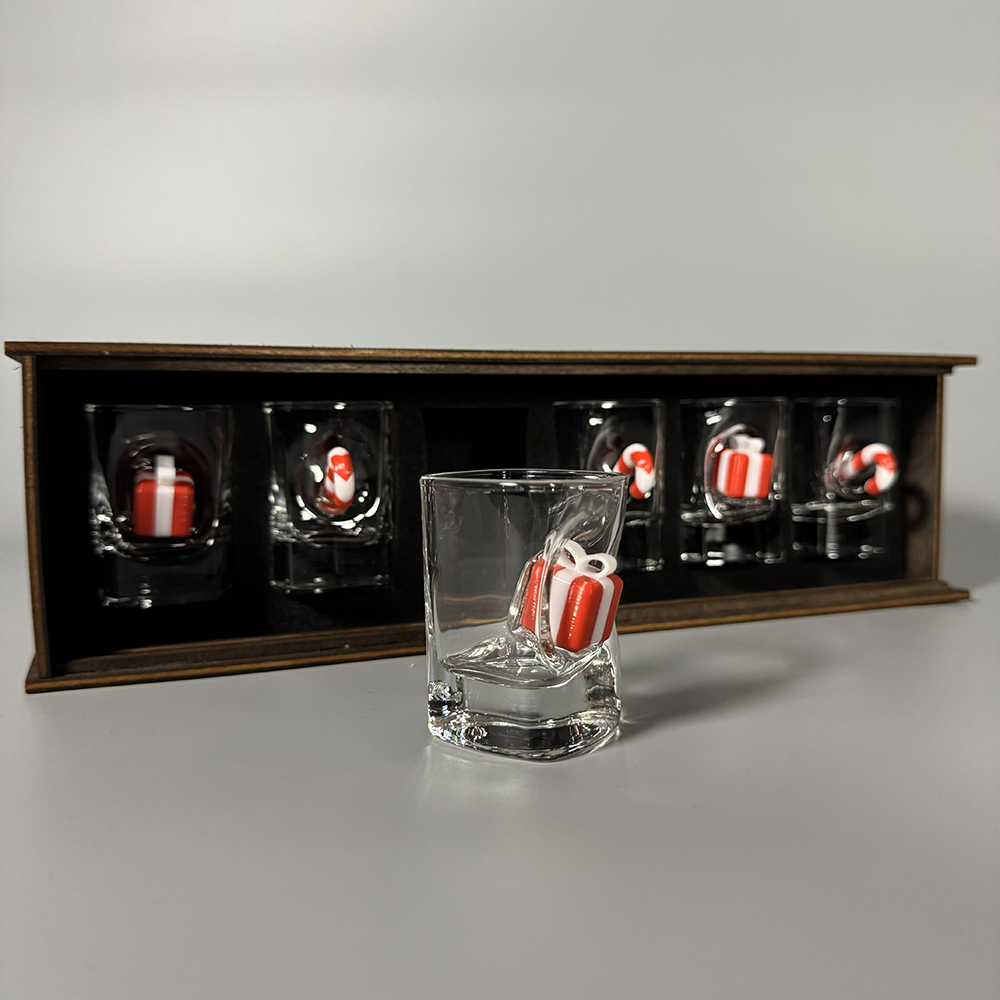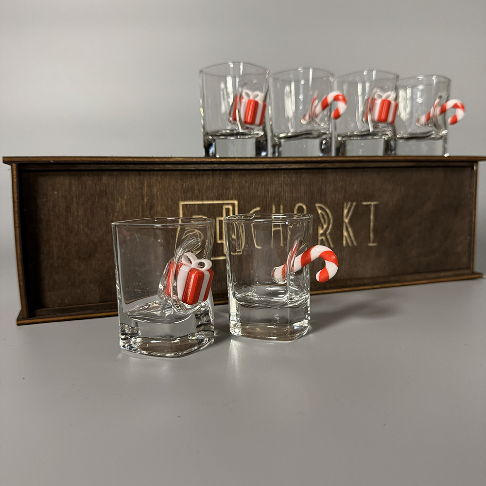 Подарунковий набір чарок “Новорічний” — це поєднання оригінального дизайну та приємного сюрпризу. Кожна чарка доповнена декоративною вставкою у вигляді цукерки та міні-подарунка, що надає виробу унікального вигляду й створює святковий настрій з першого погляду.