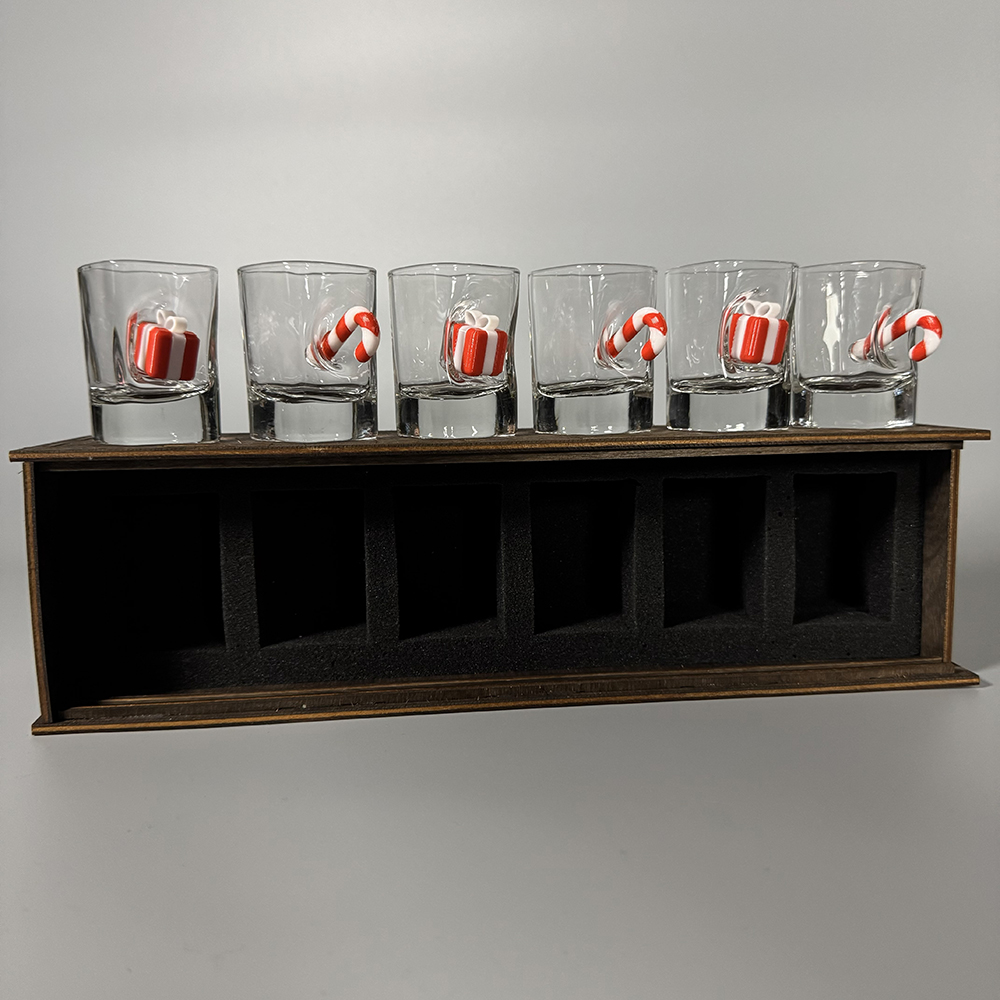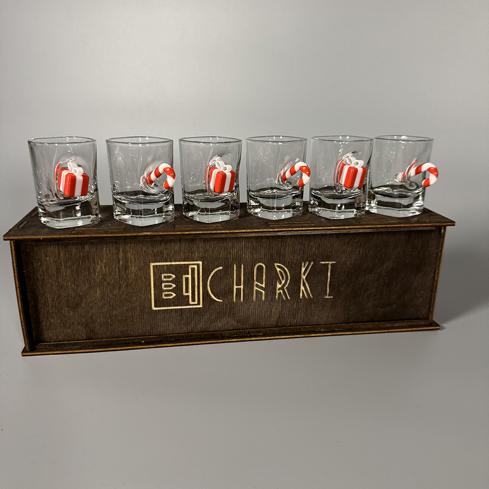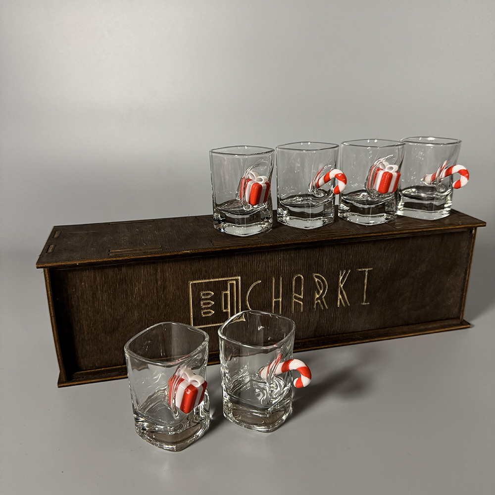 Чарки виготовлені з якісного прозорого скла, зручні для щоденного використання та святкових застіль. Стильне дерев’яне пакування підкреслює естетику набору, забезпечує надійне зберігання та робить його повністю готовим до вручення як подарунок.